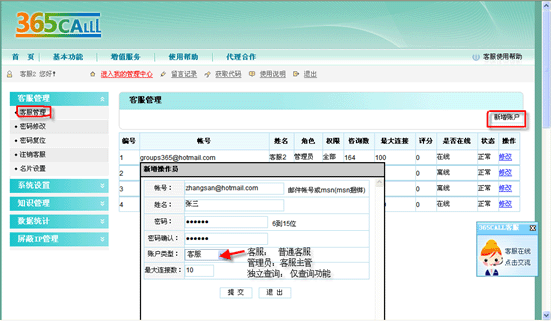 登錄kf000在線客服系統(tǒng)網(wǎng)站,進入管理中心,點擊“客服管理”,可“新增賬戶”進行添加客服: