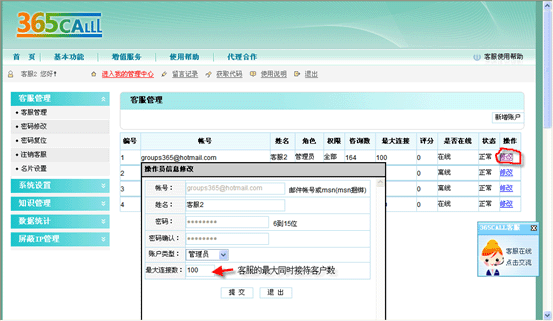 需要修改客服姓名和類型,可選中某個客服,點擊“修改”: