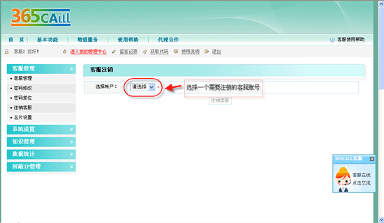 如要注銷某個客服賬戶,點擊“客戶管理” -> “注銷客服”,選擇一個需要注銷的客服: