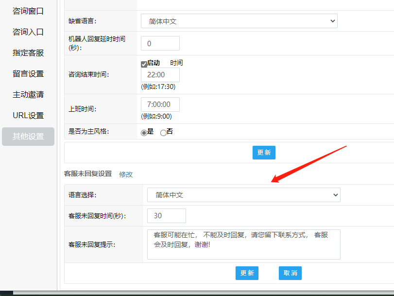 訪客可在客服休息時(shí)間或忙碌未及時(shí)回復(fù)時(shí)將自己的聯(lián)系方式留下,等待客服回呼解決問題,可在“系統(tǒng)設(shè)置-媒體對接-網(wǎng)頁(網(wǎng)站)-設(shè)置-咨詢?nèi)肟凇?/span>